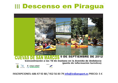 Este año celebramos la 3ª edición del DESCENSO EN PIRAGUA en el tramo del río Genil a su paso por la localidad de Cuevas de San Marcos, en la Sierra Norte de Málaga. La fecha elegida es el domingo 9 de septiembre. Adjunto cartel del evento.